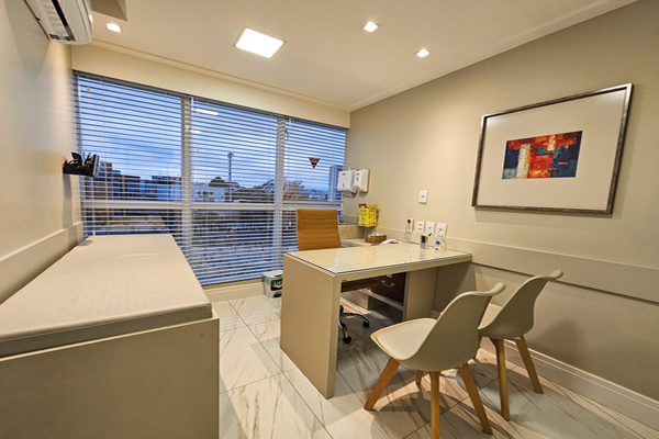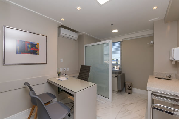A estrutura consiste em um ambiente muito agradável, novo e climatizado. O espaço é constituído por 12 consultórios de alto padrão (abaixo com maiores detalhes), possuindo banheiro adaptável para cadeirante, com trocador e outro para profissionais/funcionários. Oferecemos água e café para profissionais e pacientes. O prédio também contempla copa, com espaço para refeição, assim como farmácia, bistrôs e restaurantes. Estacionamento de fácil acesso.