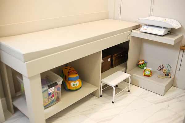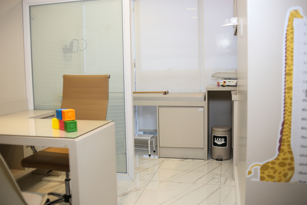 Sala 4 e 5 (menores) – Clinica Geral: janela com vista, maca não reclinável, mesa para atendimento com álcool gel à disposição, cadeira com encosto para o profissional, duas cadeiras para pacientes/clientes, pia com dispenser de saboneteira e papel toalha para higienização de mãos. DESCARPACK para descarte de agulhas /perfurocortantes. Contém esfigmomanômetro, estadiômetro de parede e balança digital. Gaveta disponível com chave de uso exclusivo como porta-volume.