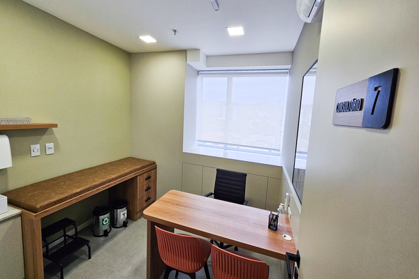 Sala 7 (menor) – Clinica Geral: janela com vista, maca não reclinável, mesa para atendimento com álcool gel à disposição, cadeira com encosto para o profissional, duas cadeiras para pacientes/clientes, pia com dispenser de saboneteira e papel toalha para higienização de mãos. DESCARPACK para descarte de agulhas /perfurocortantes. Contém esfigmomanômetro, estadiômetro de parede e balança digital. Gaveta disponível com chave de uso exclusivo como porta-volume.